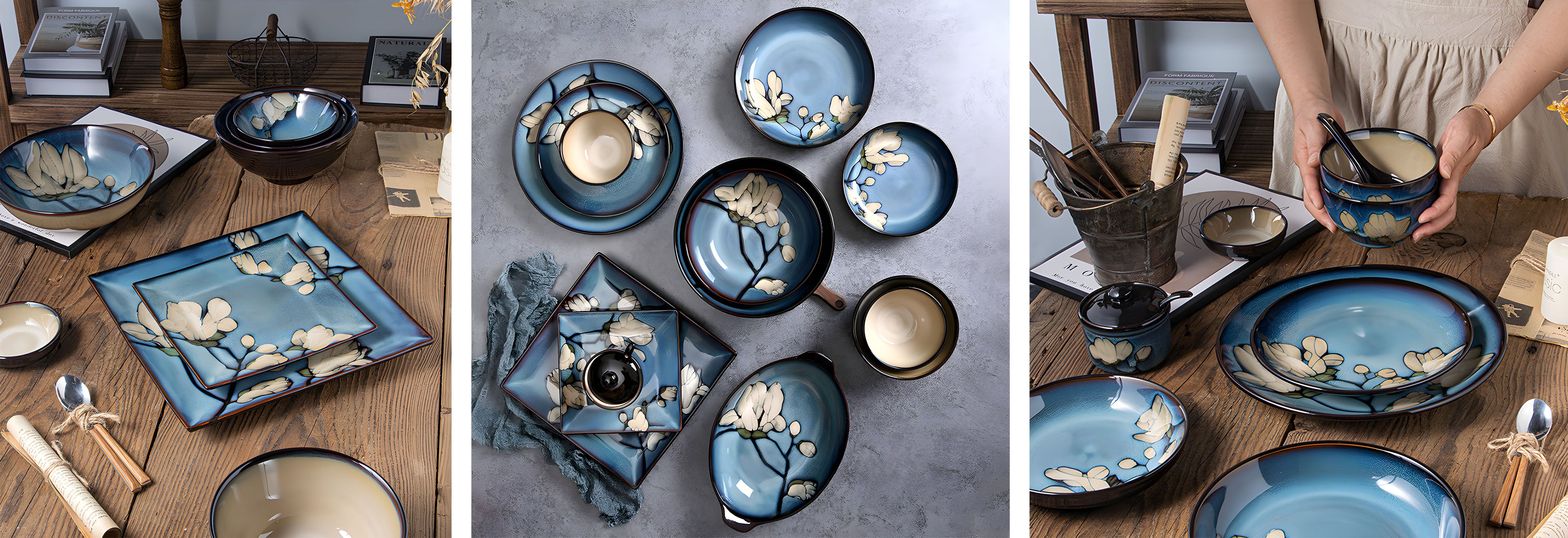 Dieses elegante Tafelservice zeigt elfenbeinfarbene Magnolienblüten auf einem tiefblauen Farbverlauf und verbindet natürliche Schönheit mit raffiniertem Design. Die glasierten Keramikstücke – darunter Teller, Schalen, Tassen und Servierplatten – sind robust und glänzend verarbeitet. Ideal für den täglichen Gebrauch oder besondere Anlässe, verleiht diese Kollektion jedem modernen oder rustikalen Tisch eine stilvolle, von der Natur inspirierte Note.